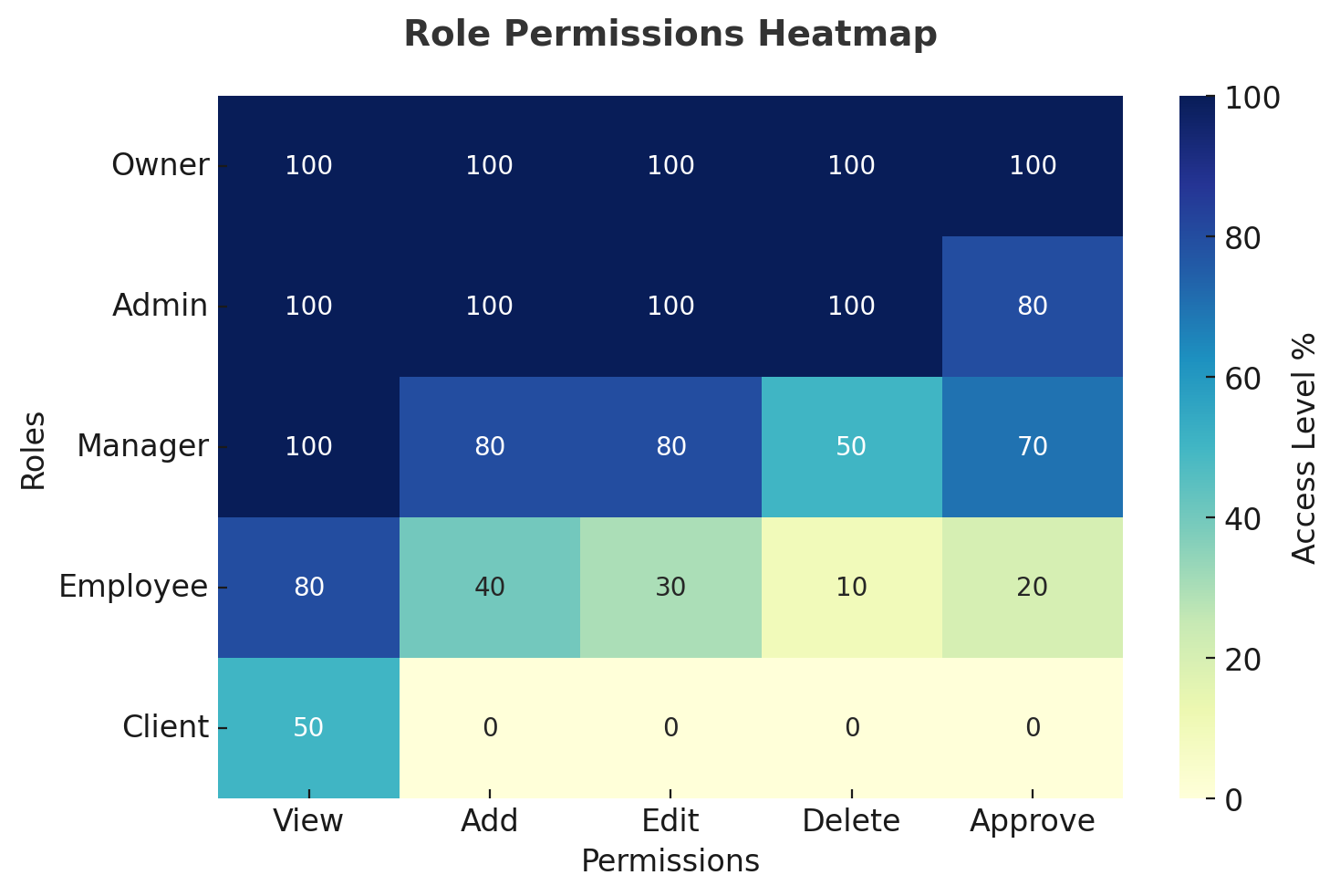 The heatmap presents a visual representation of access levels across different modules and features. Each row corresponds to a module (e.g., Projects, Tasks, Reports), and each column represents a role (Owner, Admin, Manager, Employee, Client).
