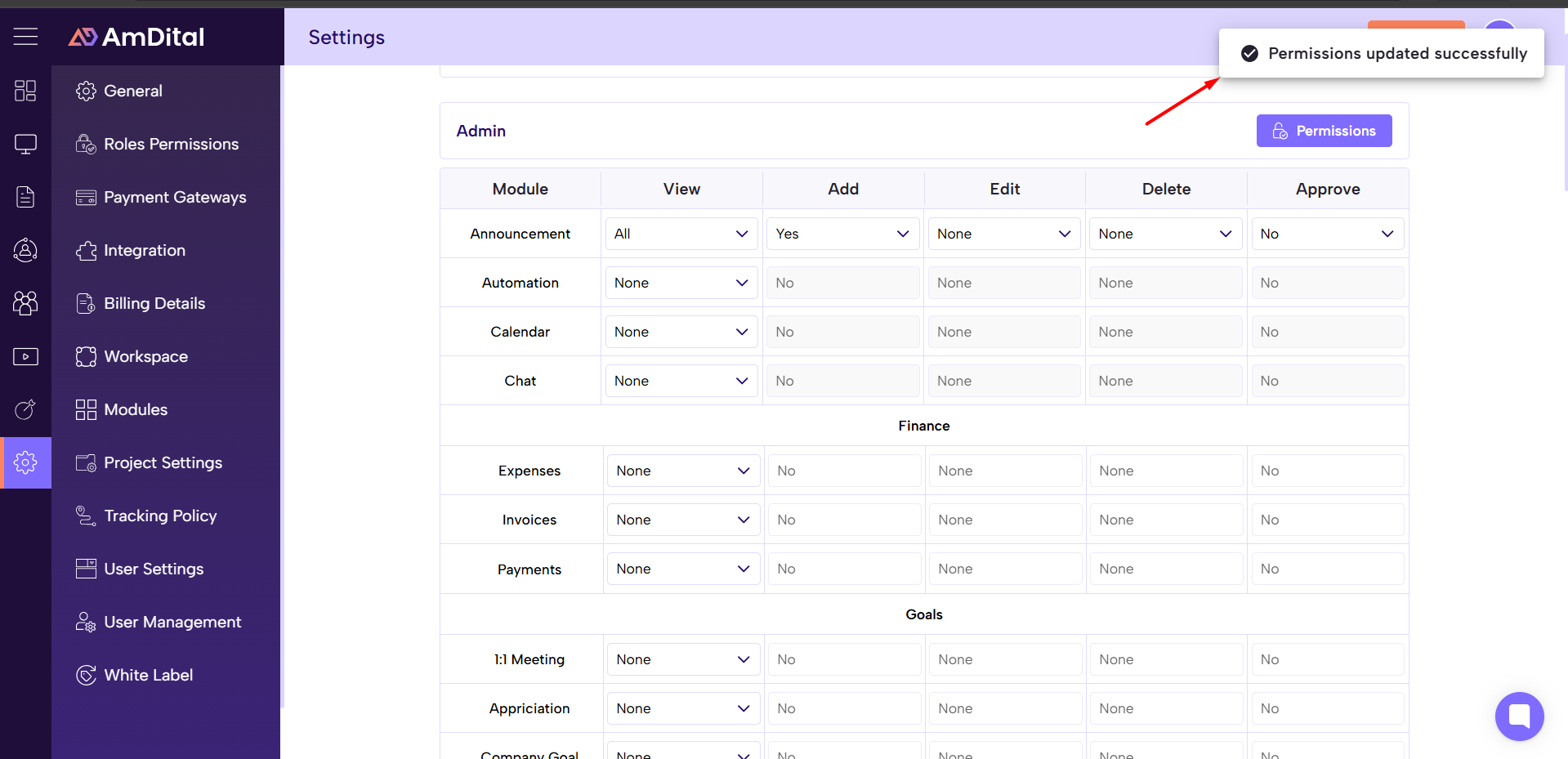 Amdital allows you to control what each role can do across all modules.