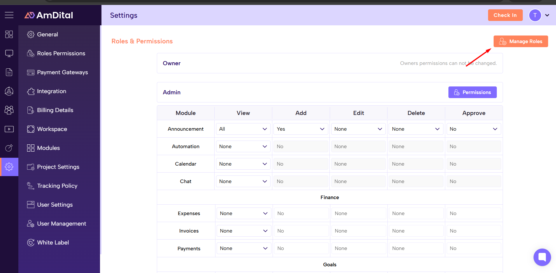Amdital provides a central page to manage all roles in the system.