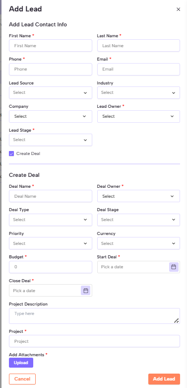 The Add Lead feature lets you enter details of a new potential customer, including contact info, company details, and related deal information. This helps track every inquiry and convert it into a successful sale.