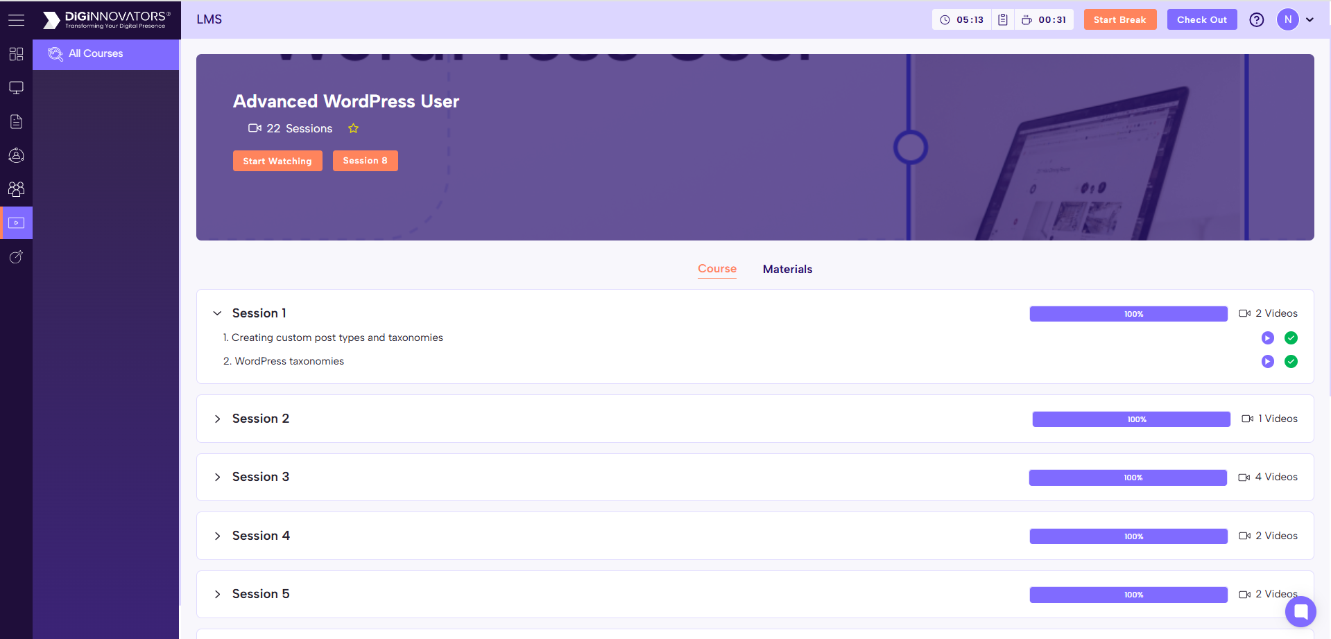 Click on Start Watching to begin a course or Resume to continue from the last session.