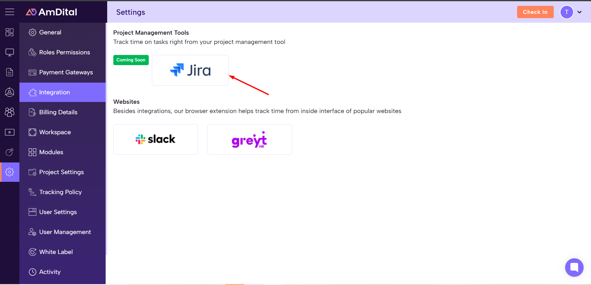 1. In AmDital’s integration settings, select Jira.