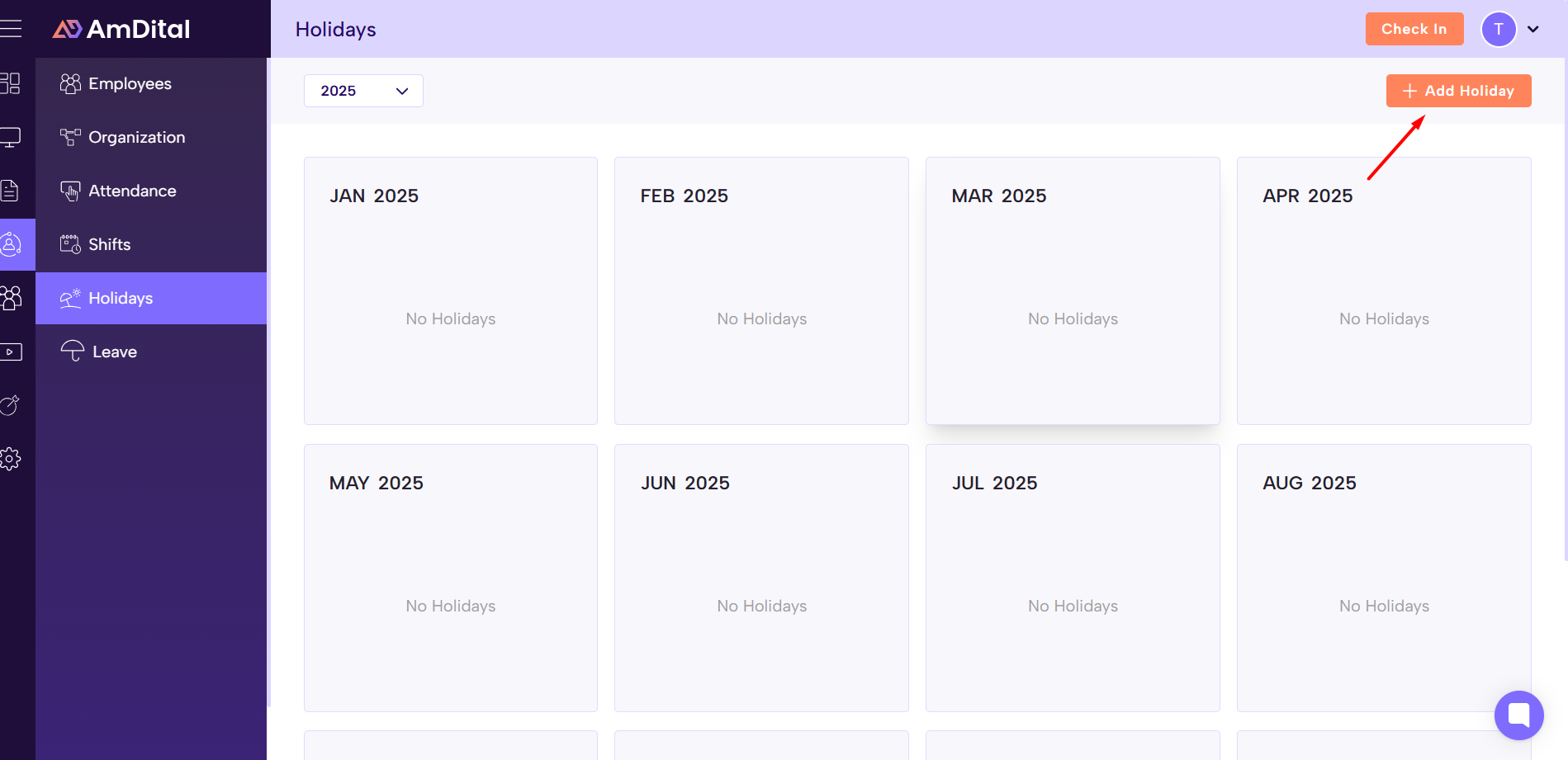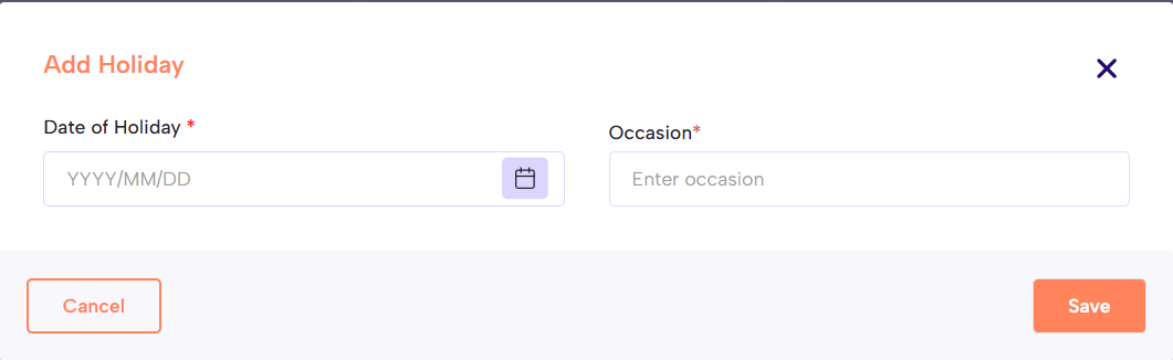 Admins can create holidays by entering the holiday name, date, applicable locations, and departments.
